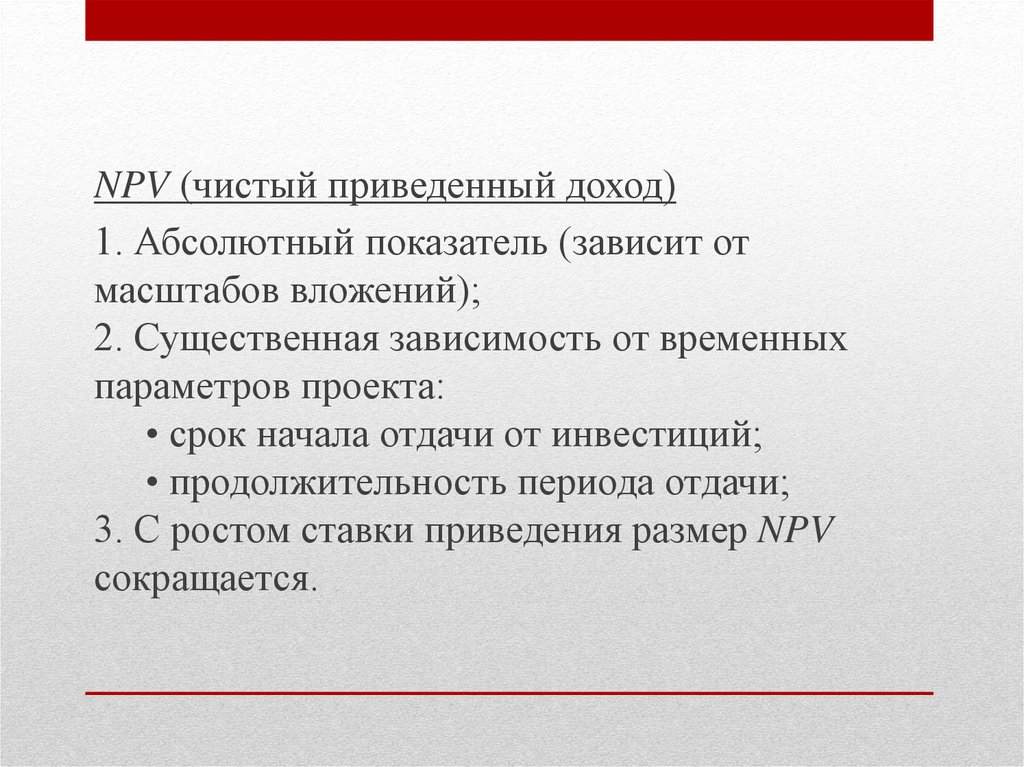 NPV (чистый приведенный доход)1. Абсолютный показатель (зависит от