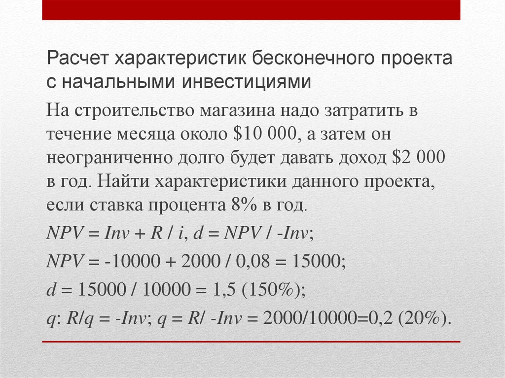 Расчет характеристик бесконечного проектас начальными инвестициями