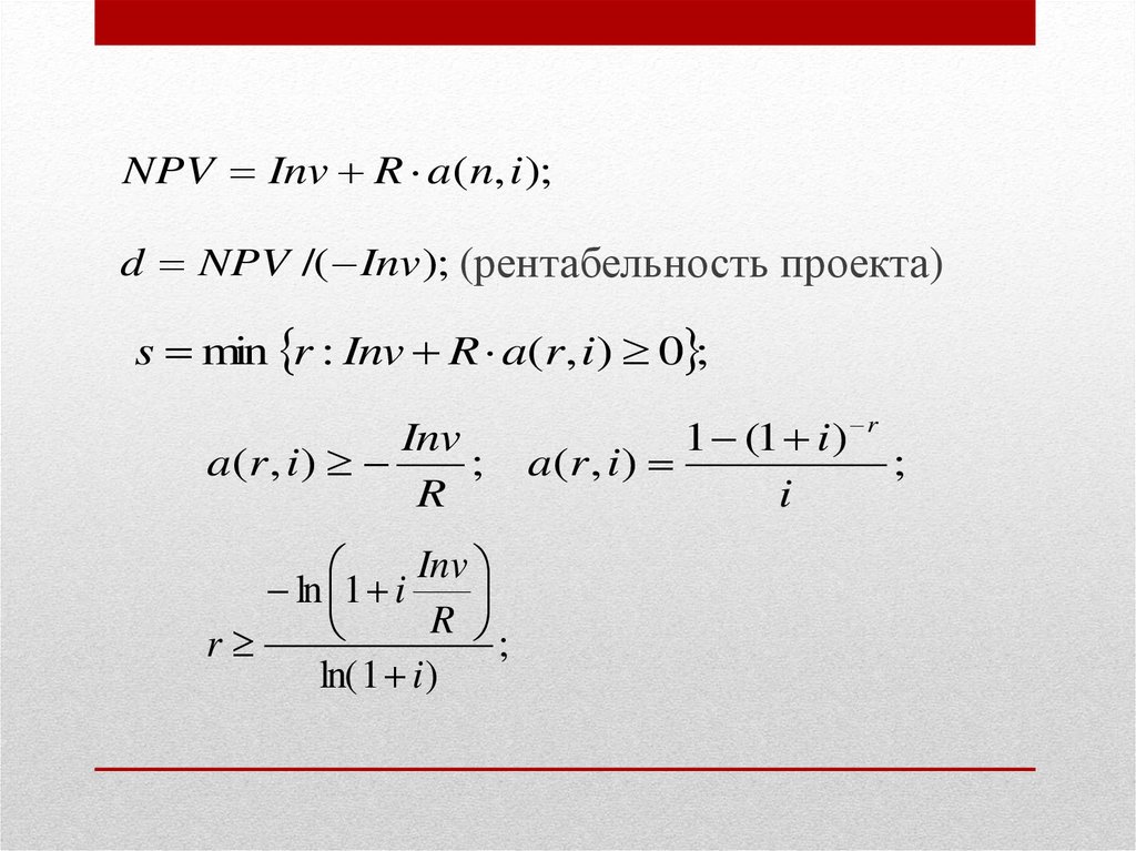 NPV Inv R a (n, i );d NPV /( Inv ); (рентабельность проекта)