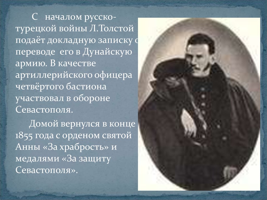 С началом русскотурецкой войны Л.Толстойподаёт докладную записку о