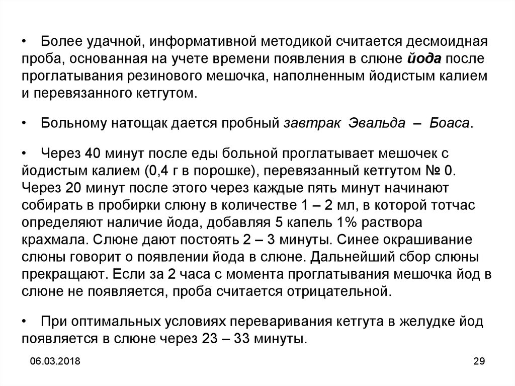 • Более удачной, информативной методикой считается десмоиднаяпроба, основанная на учете времени появления в слюне йода после