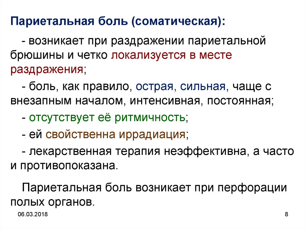 Различают висцеральную и париетальную боль.Висцеральная боль возникает при раздражении