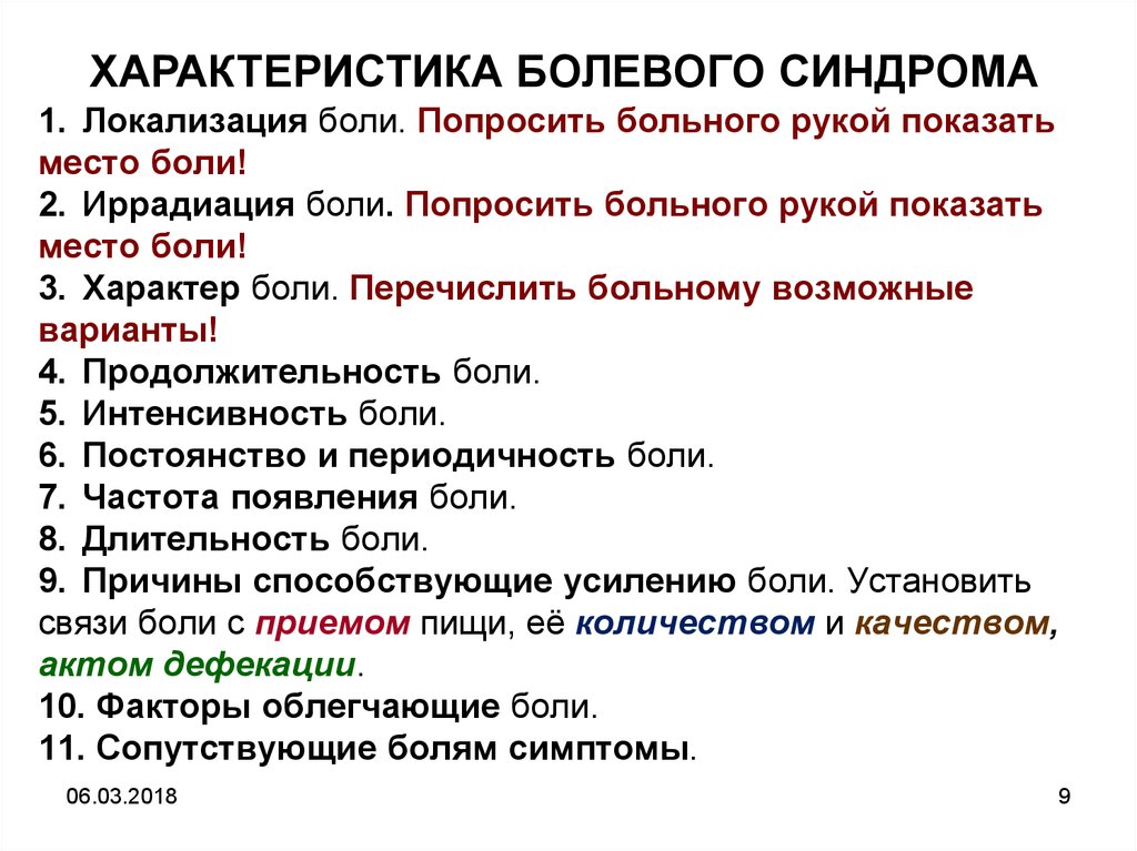 ХАРАКТЕРИСТИКА БОЛЕВОГО СИНДРОМА1. Локализация боли. Попросить больного рукой показать