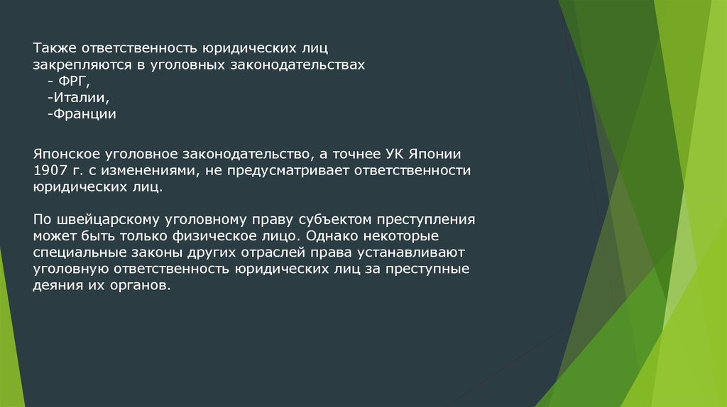 Также ответственность юридических лицзакрепляются в уголовных законодательствах