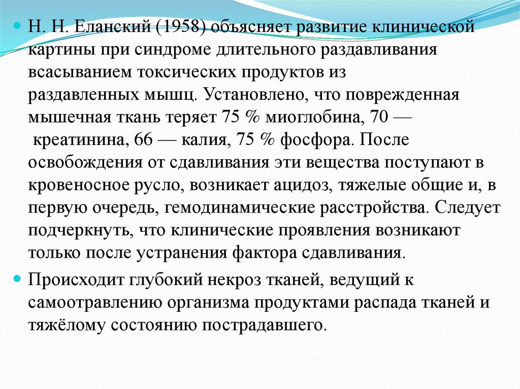 Н. Н. Еланский (1958) объясняет развитие клиническойкартины при синдроме длительного раздавливания