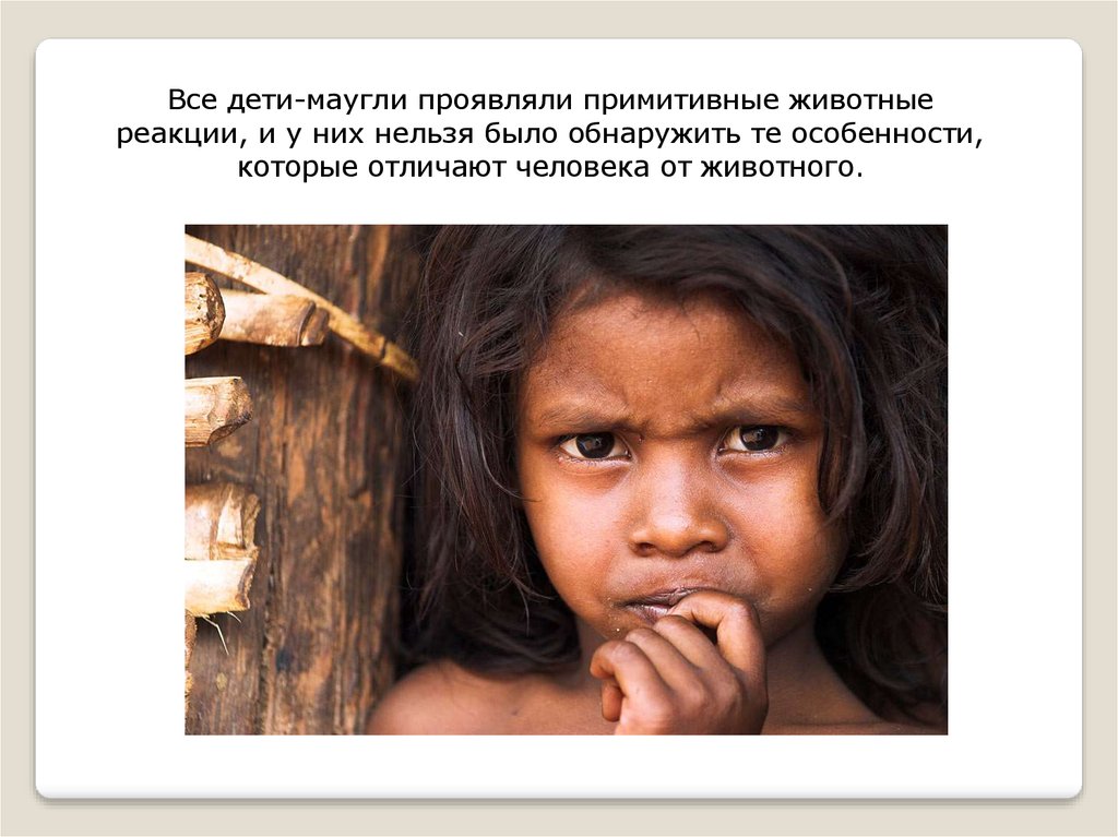 Все дети-маугли проявляли примитивные животныереакции, и у них нельзя было обнаружить те особенности,