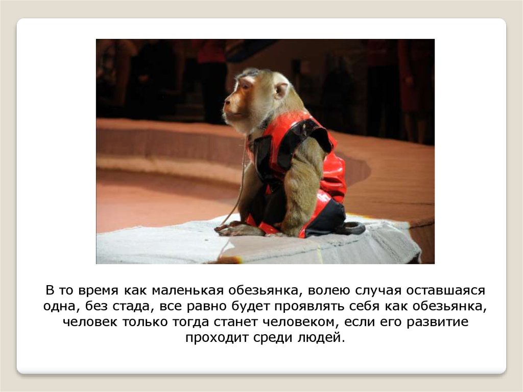 В то время как маленькая обезьянка, волею случая оставшаясяодна, без стада, все равно будет проявлять себя как обезьянка,
