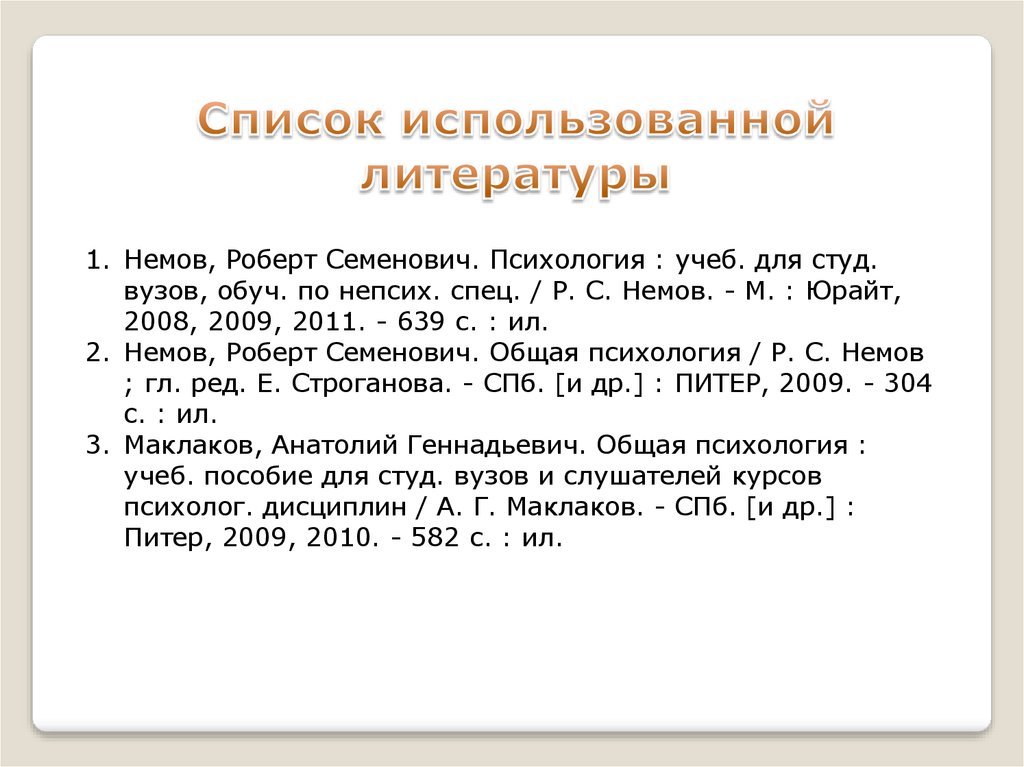 1. Немов, Роберт Семенович. Психология : учеб. для студ.вузов, обуч. по непсих. спец. / Р. С. Немов. - М. : Юрайт,