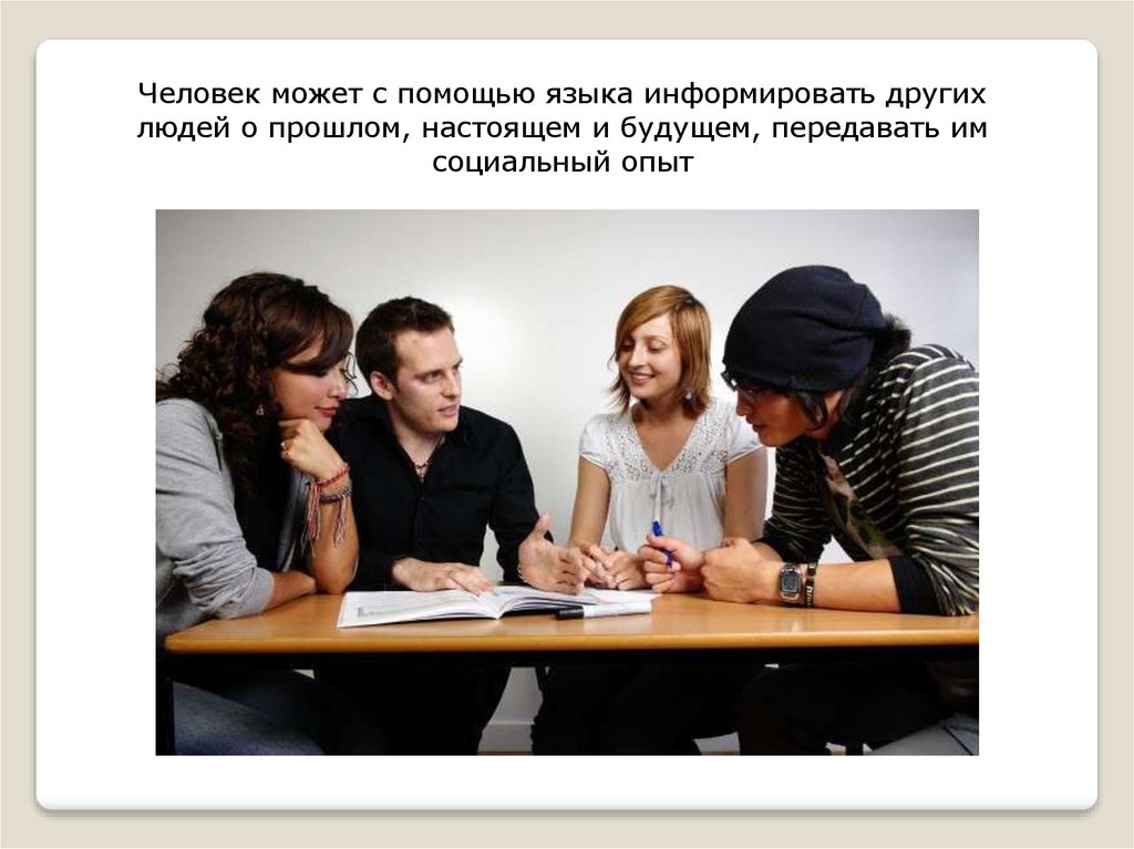 Человек может с помощью языка информировать другихлюдей о прошлом, настоящем и будущем, передавать им