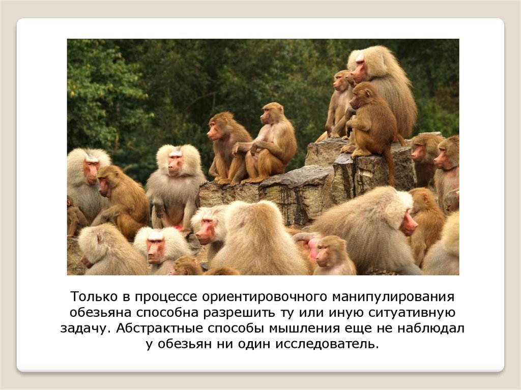 Только в процессе ориентировочного манипулированияобезьяна способна разрешить ту или иную ситуативную