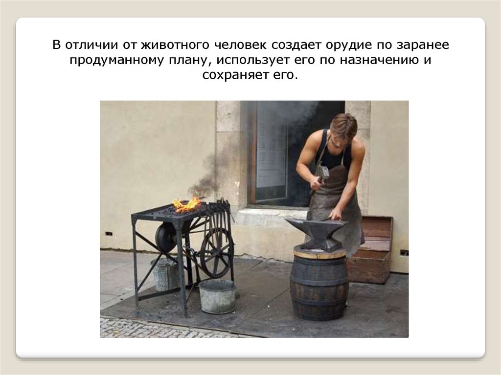 В отличии от животного человек создает орудие по заранеепродуманному плану, использует его по назначению и