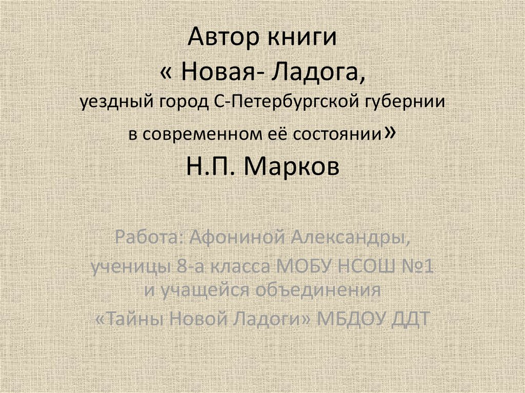 1. Автор книги « Новая- Ладога, уездный город С-Петербургской губернии в современном её состоянии» Н.П. Марков