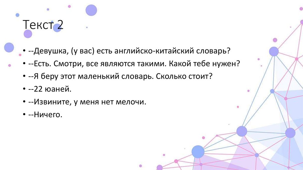 Текст 2• --Девушка, (у вас) есть английско-китайский словарь?