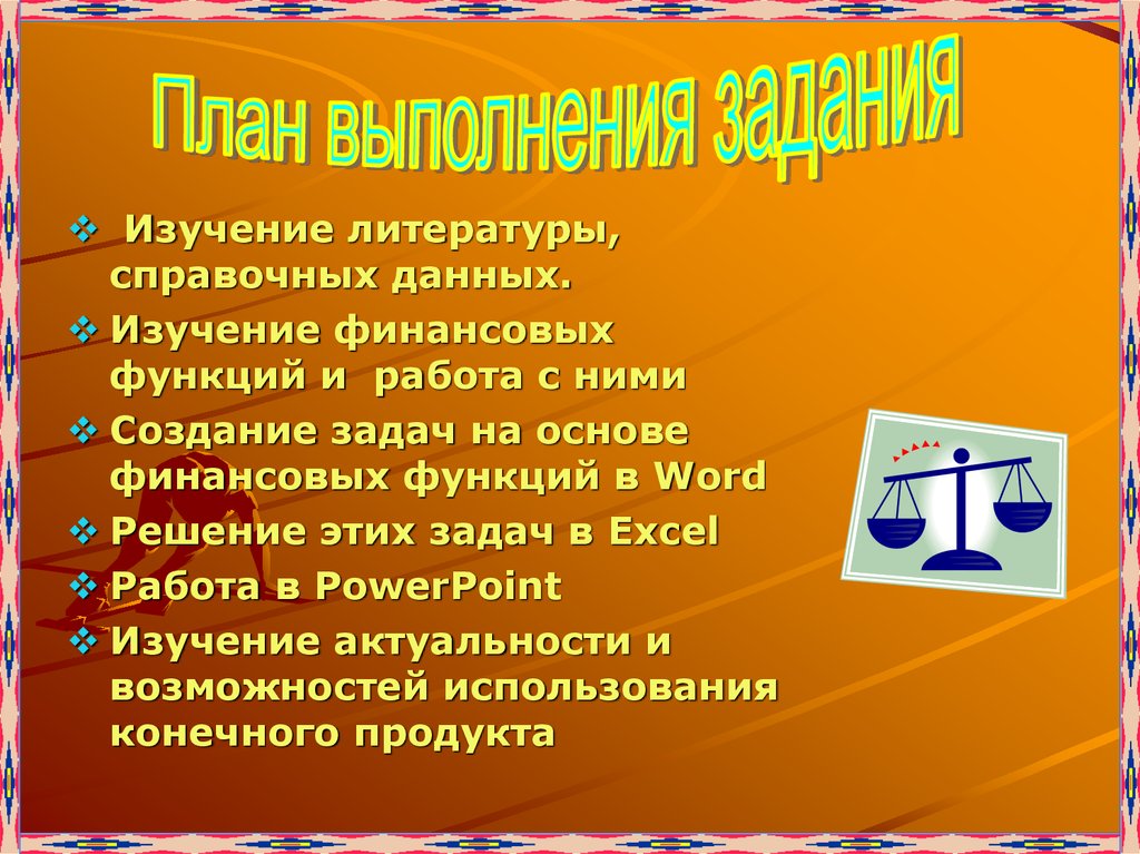 Созданный программный продукт иллюстрирует возможности примененияФинансовых функций в табличном редакторе.