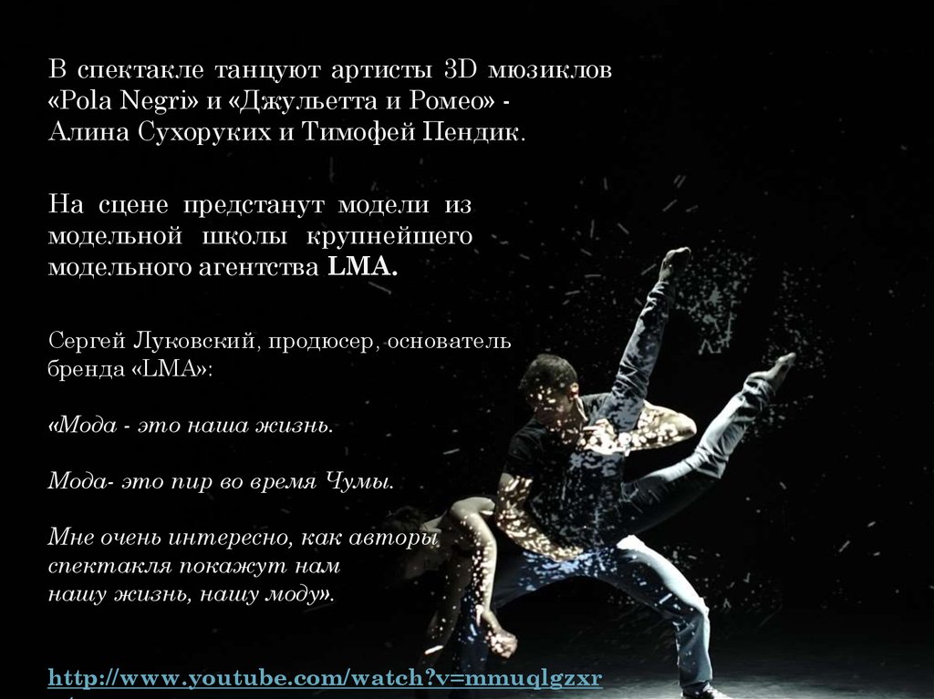 В спектакле танцуют артисты 3D мюзиклов«Pola Negri» и «Джульетта и Ромео» Алина Сухоруких и Тимофей Пендик.