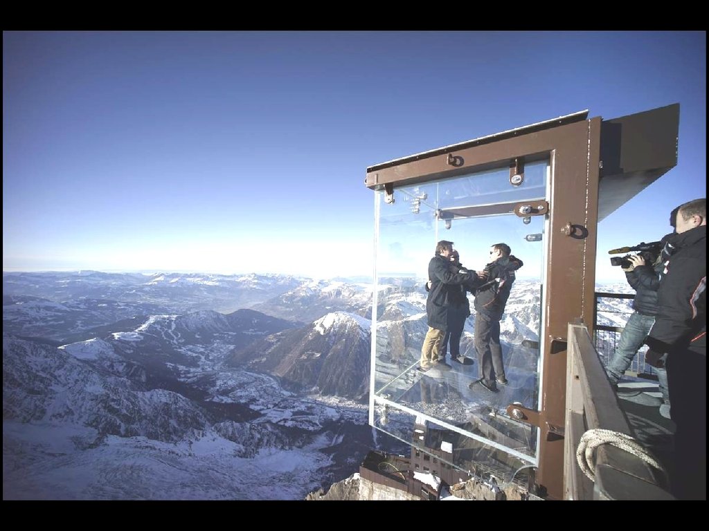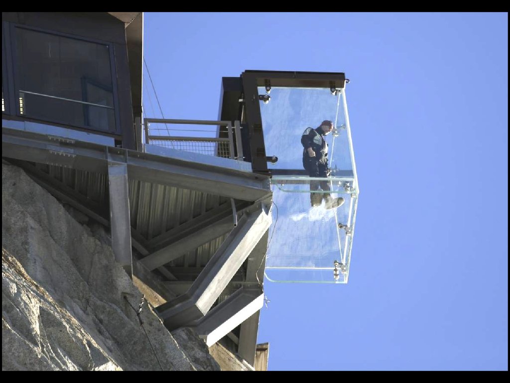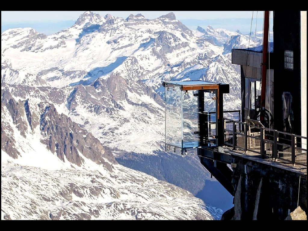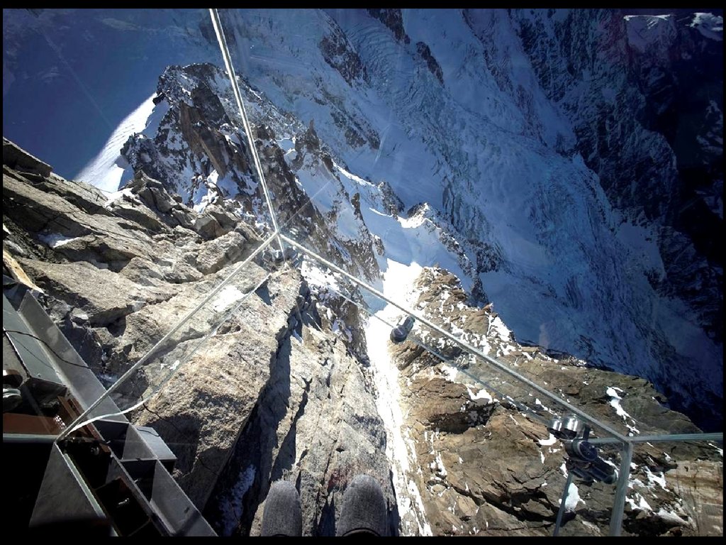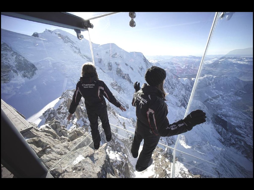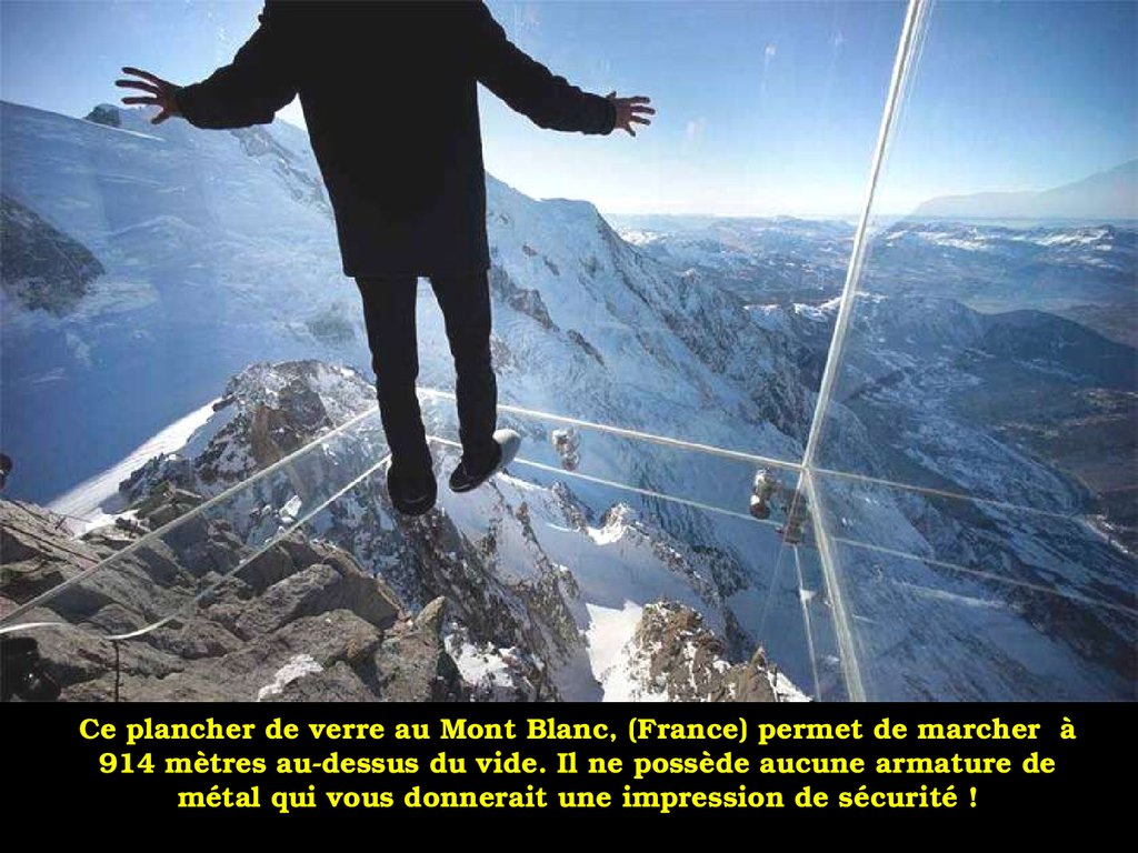 Ce plancher de verre au Mont Blanc, (France) permet de marcher à914 mètres au-dessus du vide. Il ne possède aucune armature de