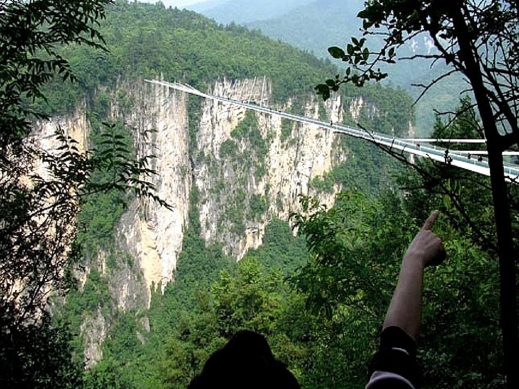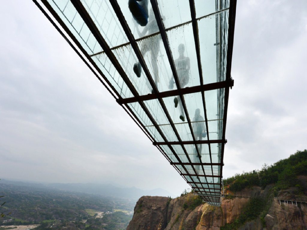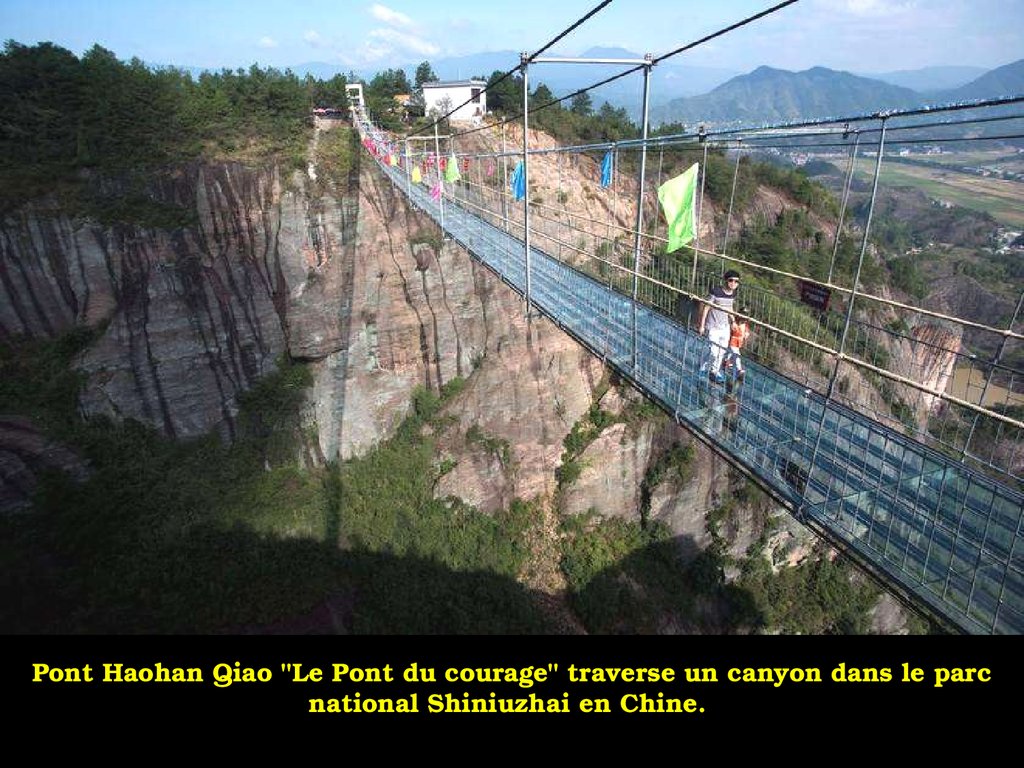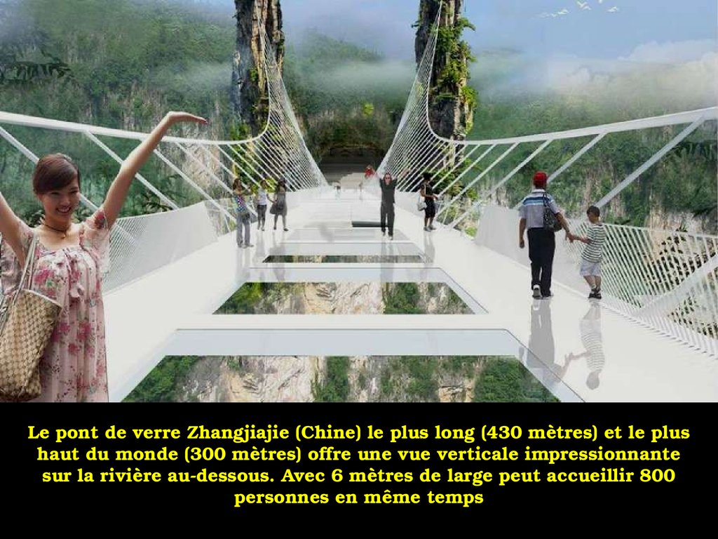 Le pont de verre Zhangjiajie (Chine) le plus long (430 mètres) et le plushaut du monde (300 mètres) offre une vue verticale impressionnante