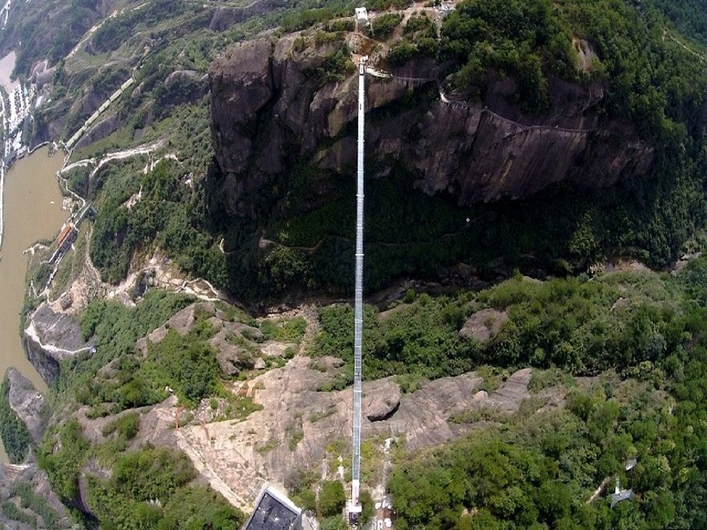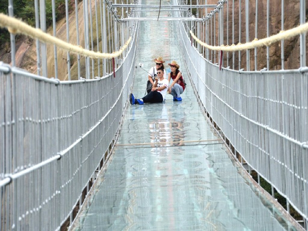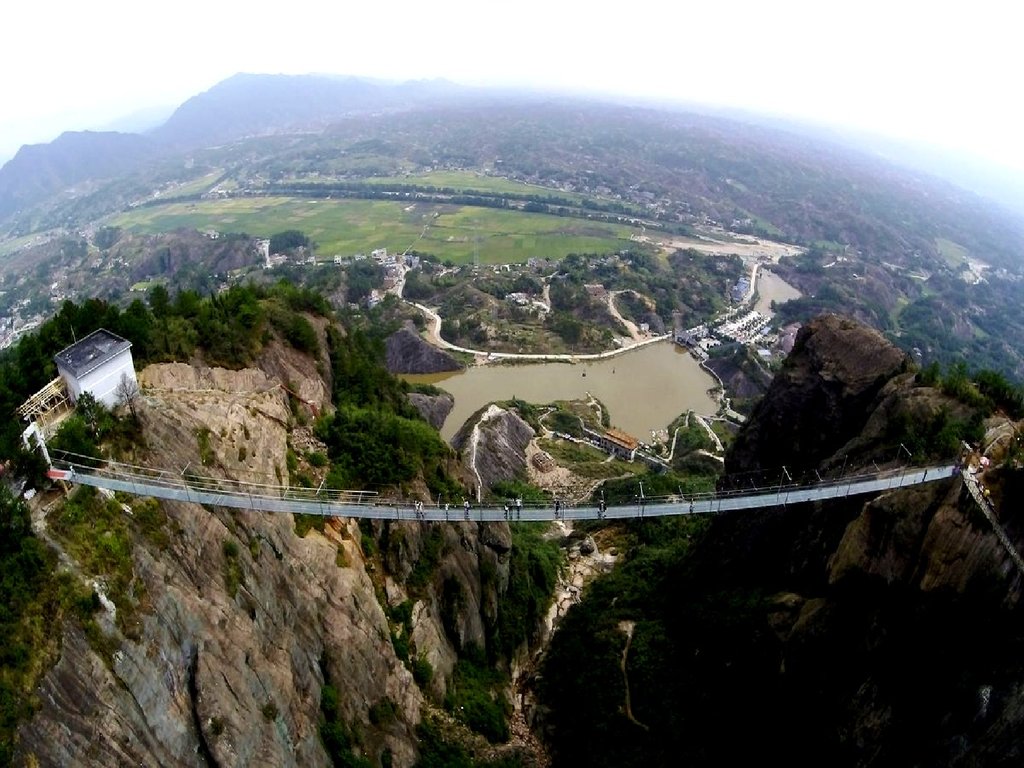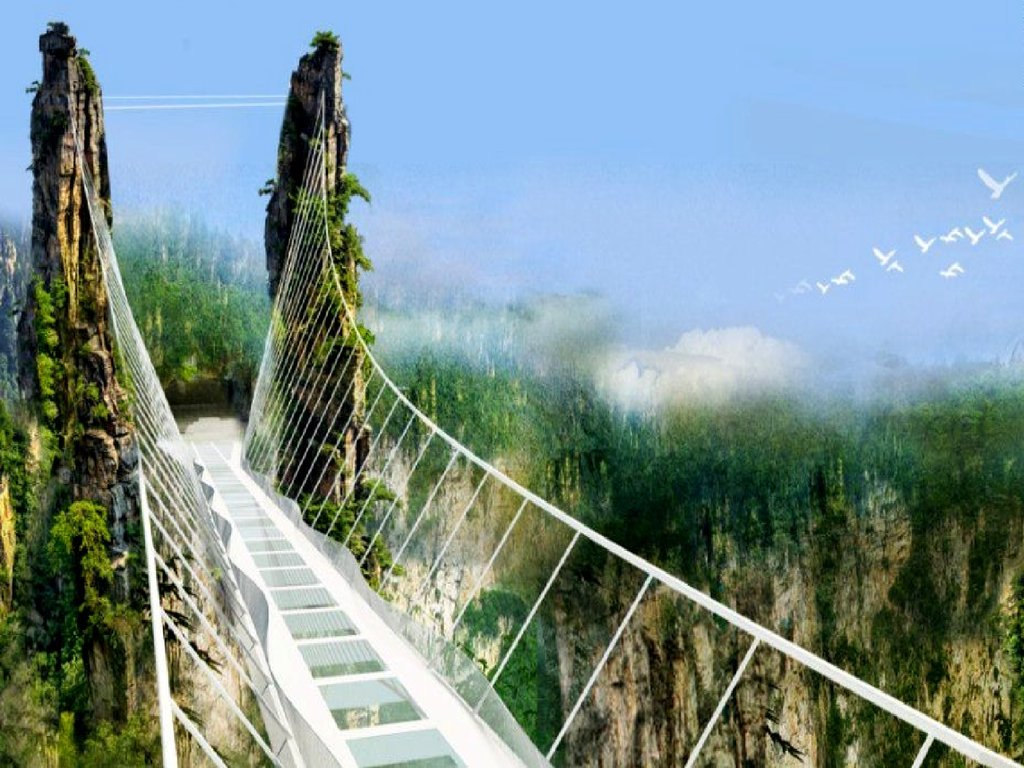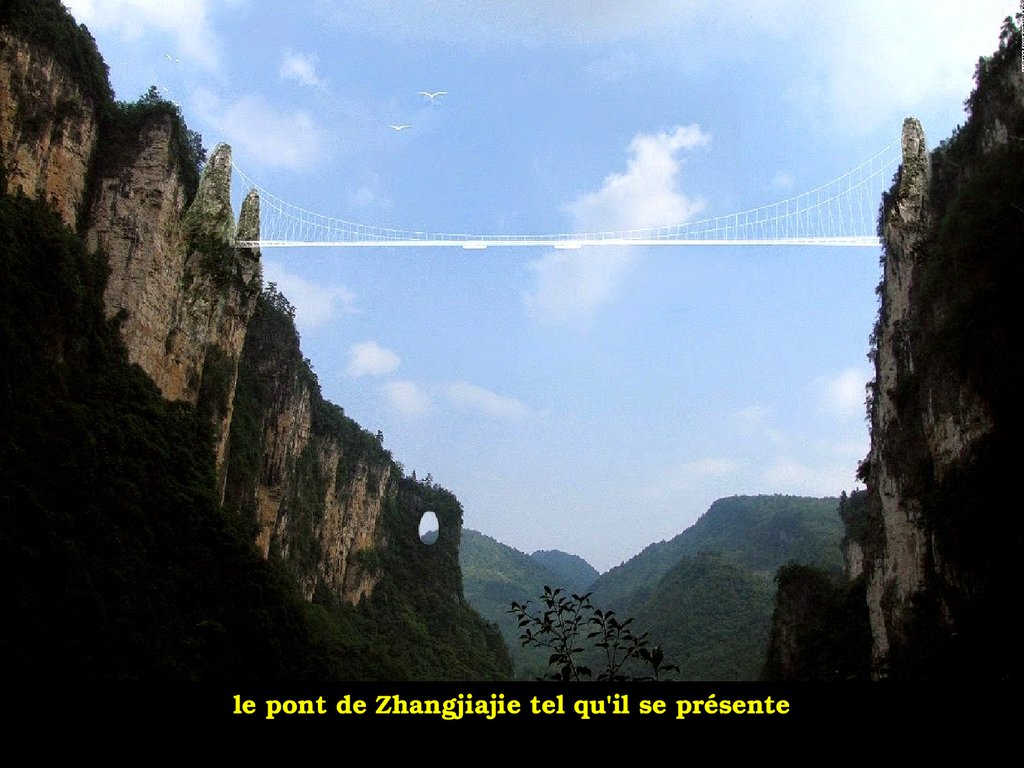 Le pont de verre Zhangjiajie (Chine) le plus long (430 mètres) et le plushaut du monde (300 mètres) offre une vue verticale impressionnante