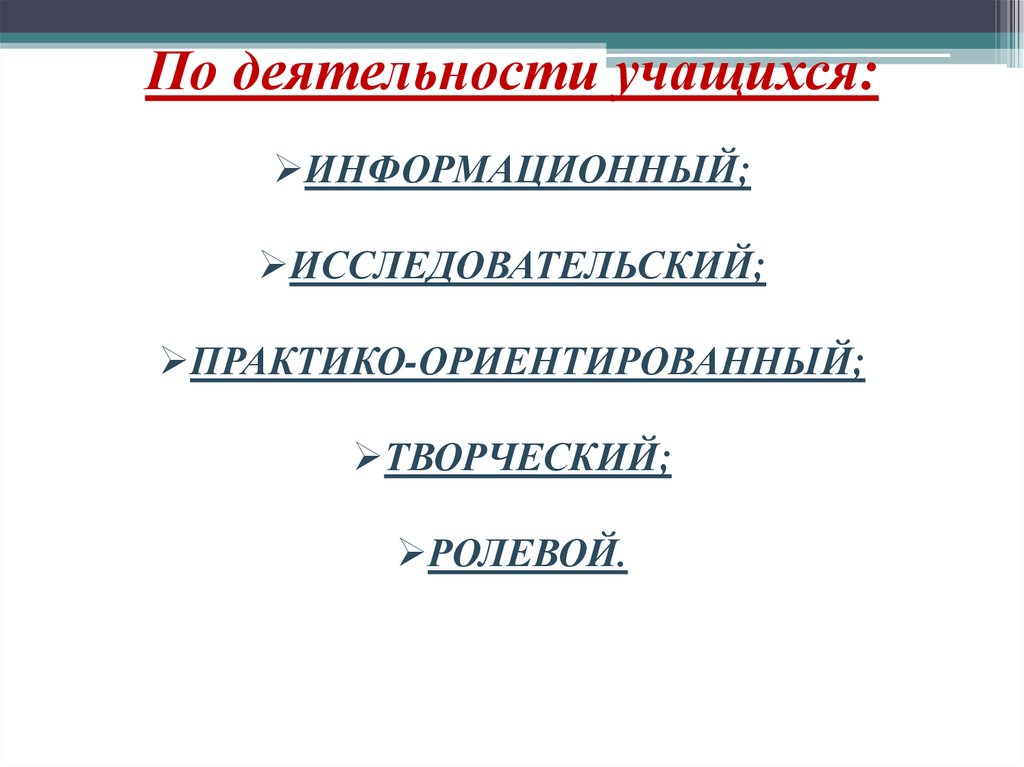 По деятельности учащихся:ИНФОРМАЦИОННЫЙ;