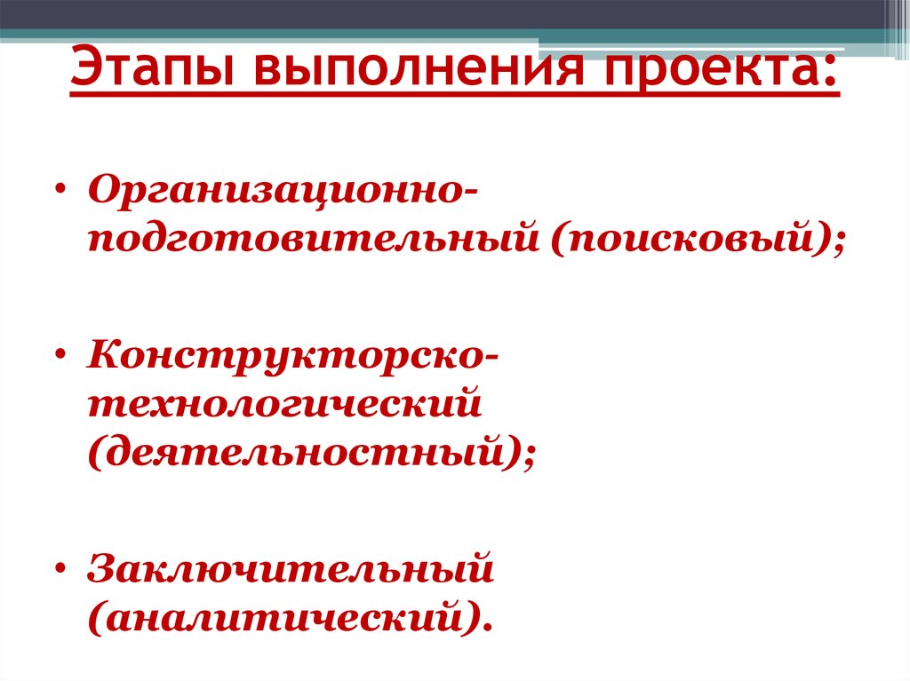 Этапы выполнения проекта:• Организационноподготовительный (поисковый);