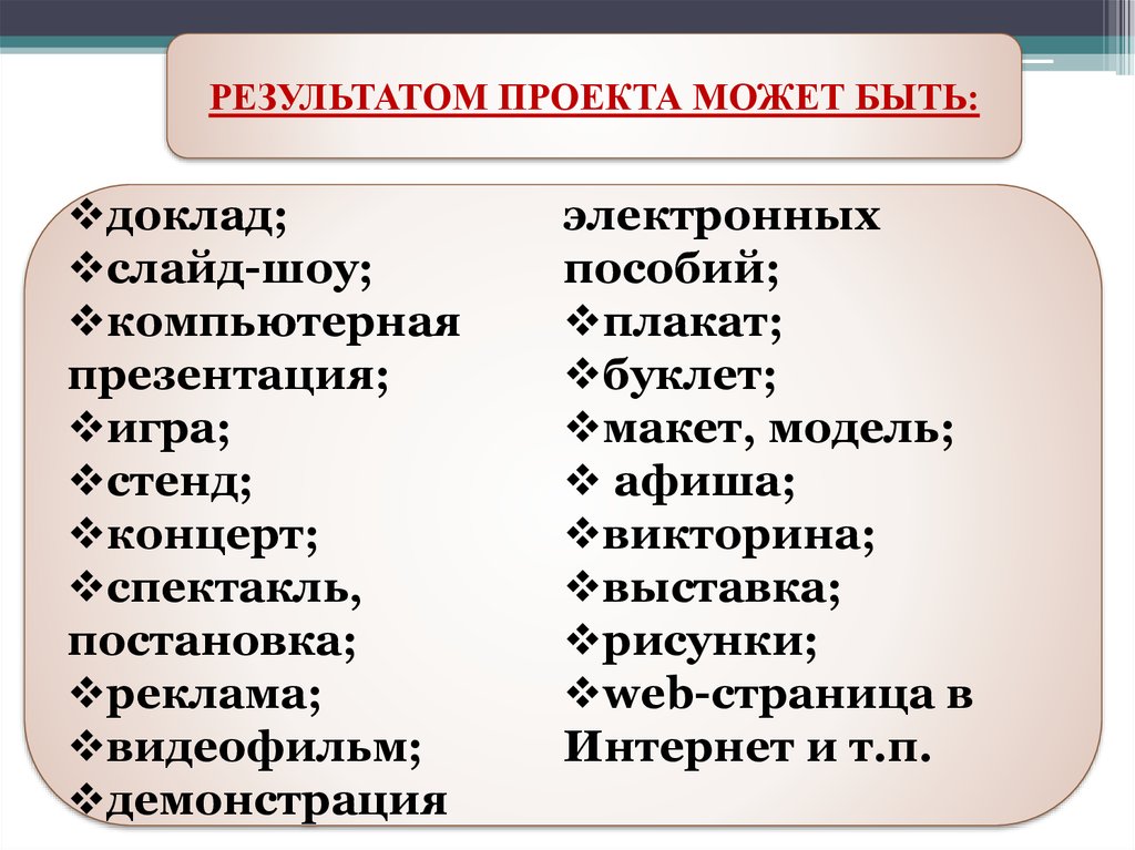 РЕЗУЛЬТАТОМ ПРОЕКТА МОЖЕТ БЫТЬ:доклад;