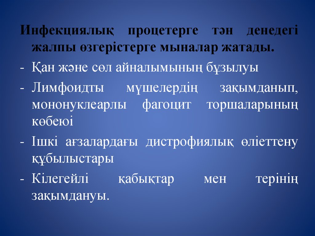 Инфекциялық процетерге тән денедегіжалпы өзгерістерге мыналар жатады.