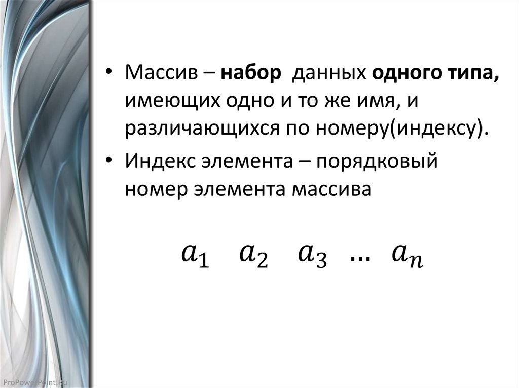 • Массив – набор данных одного типа,