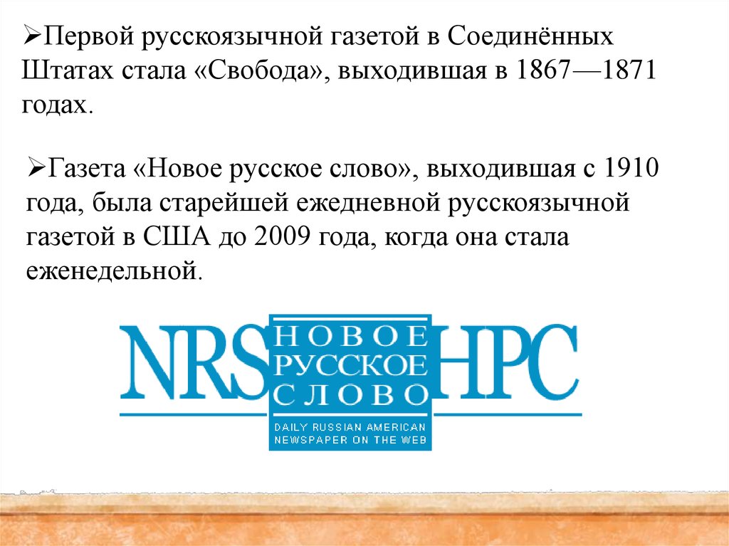 Первой русскоязычной газетой в СоединённыхШтатах стала «Свобода», выходившая в 1867—1871