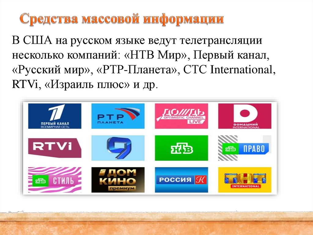 В США на русском языке ведут телетрансляциинесколько компаний: «НТВ Мир», Первый канал,