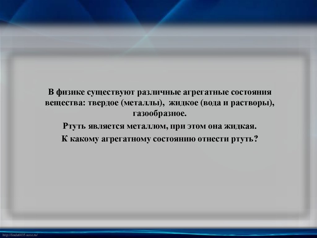 В физике существуют различные агрегатные состояниявещества: твердое (металлы), жидкое (вода и растворы),