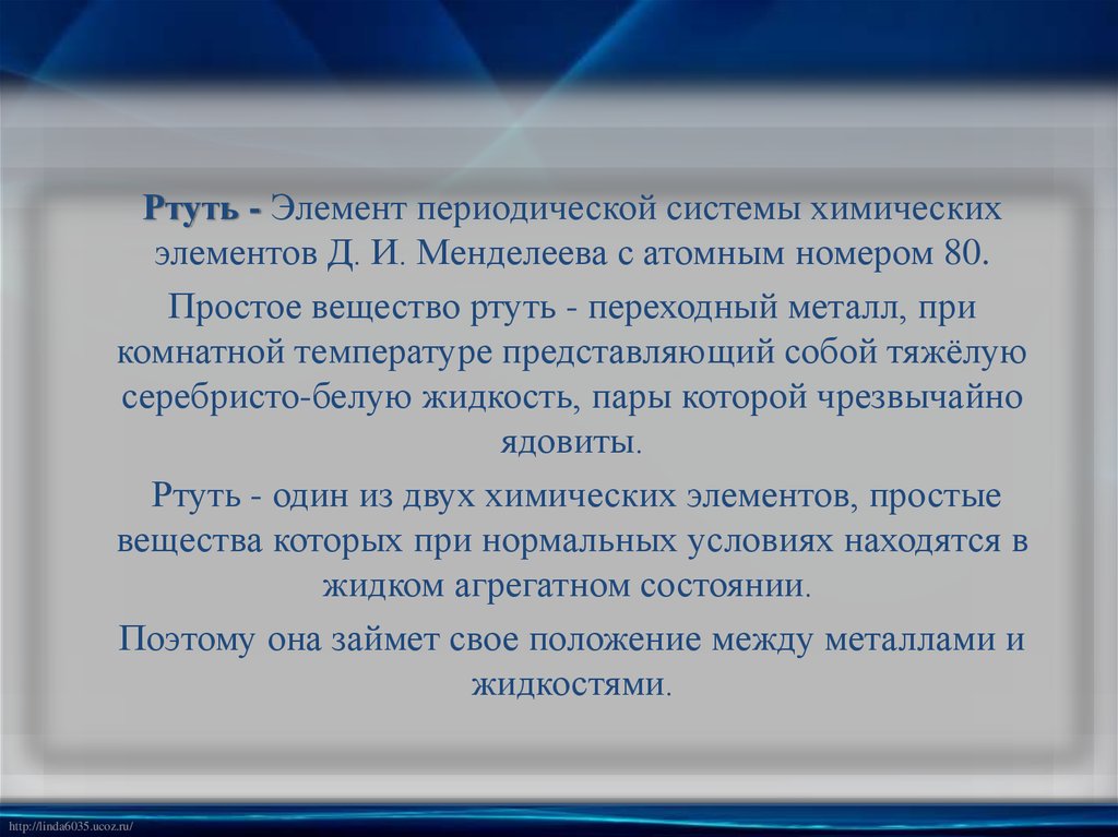 Ртуть - Элемент периодической системы химическихэлементов Д. И. Менделеева с атомным номером 80.