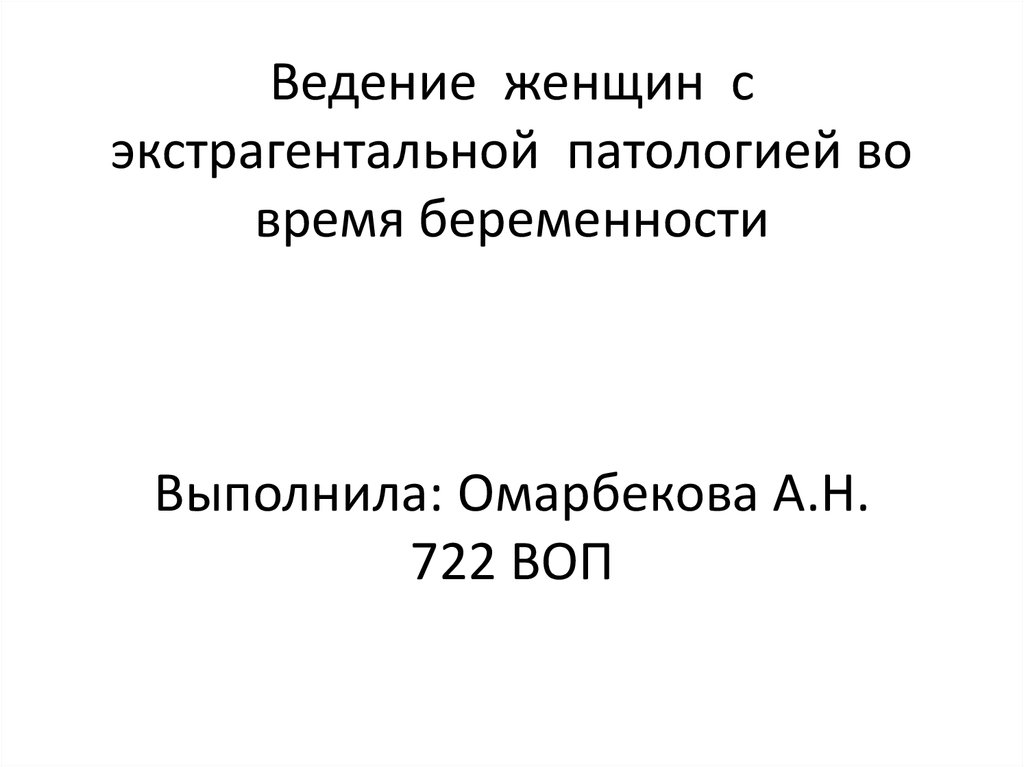 Ведение женщин с экстрагентальной патологией во время беременности Выполнила: Омарбекова А.Н. 722 ВОП