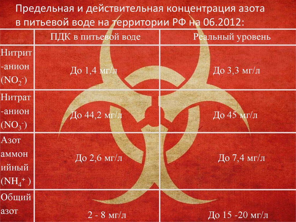 Предельная и действительная концентрация азотав питьевой воде на территории РФ на 06.2012: