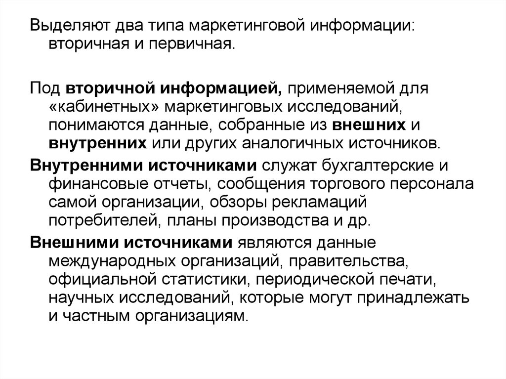 Выделяют два типа маркетинговой информации:вторичная и первичная.