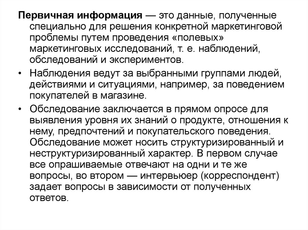 Первичная информация — это данные, полученныеспециально для решения конкретной маркетинговой