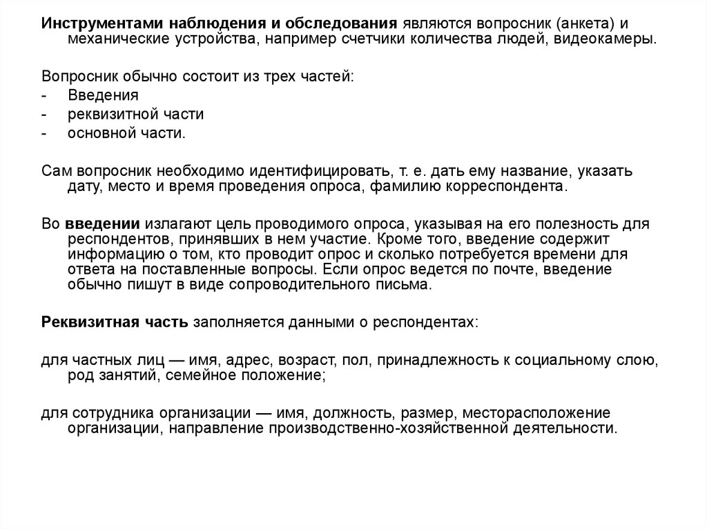 Инструментами наблюдения и обследования являются вопросник (анкета) имеханические устройства, например счетчики количества людей, видеокамеры.