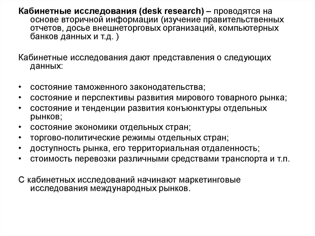 Кабинетные исследования (desk research) – проводятся наоснове вторичной информации (изучение правительственных