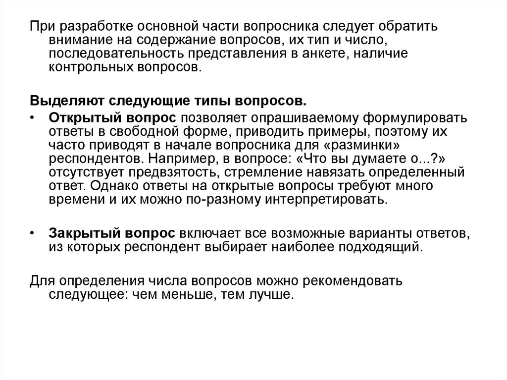 При разработке основной части вопросника следует обратитьвнимание на содержание вопросов, их тип и число,
