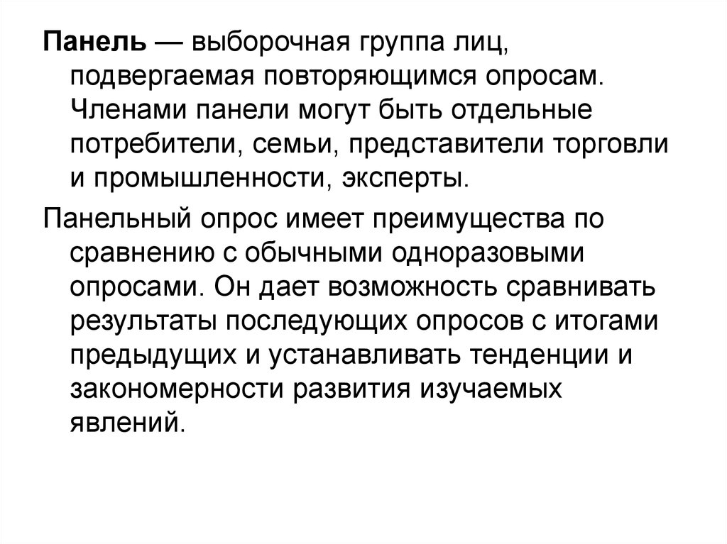 Панель — выборочная группа лиц,подвергаемая повторяющимся опросам.