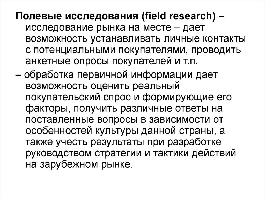 Полевые исследования (field research) –исследование рынка на месте – дает