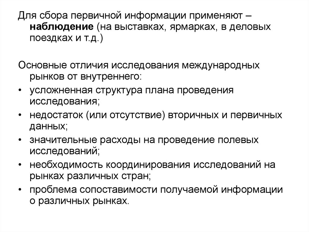 Для сбора первичной информации применяют –наблюдение (на выставках, ярмарках, в деловых