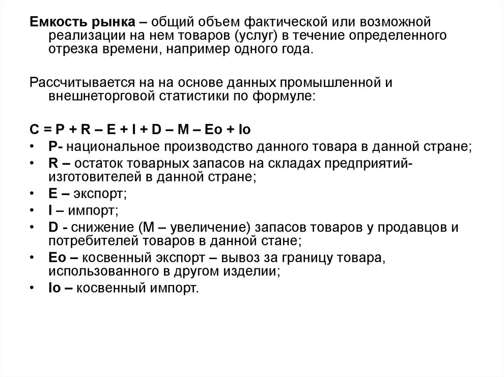 Емкость рынка – общий объем фактической или возможнойреализации на нем товаров (услуг) в течение определенного