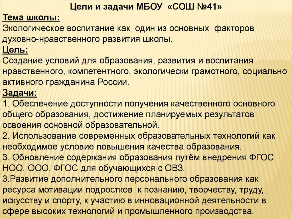 Цели и задачи МБОУ «СОШ №41»Тема школы: