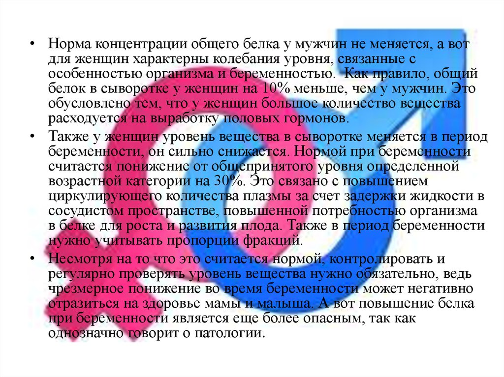 • Норма концентрации общего белка у мужчин не меняется, а вотдля женщин характерны колебания уровня, связанные с