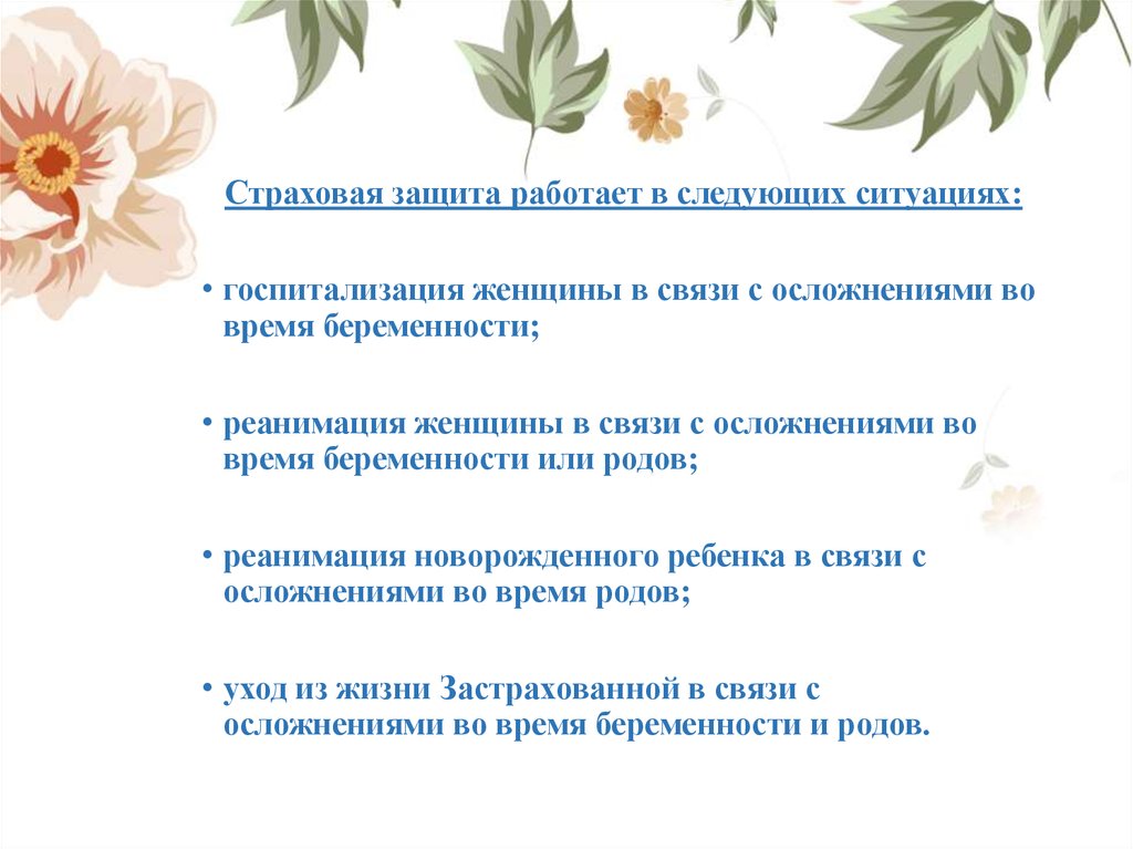 Страховая защита работает в следующих ситуациях:• госпитализация женщины в связи с осложнениями во