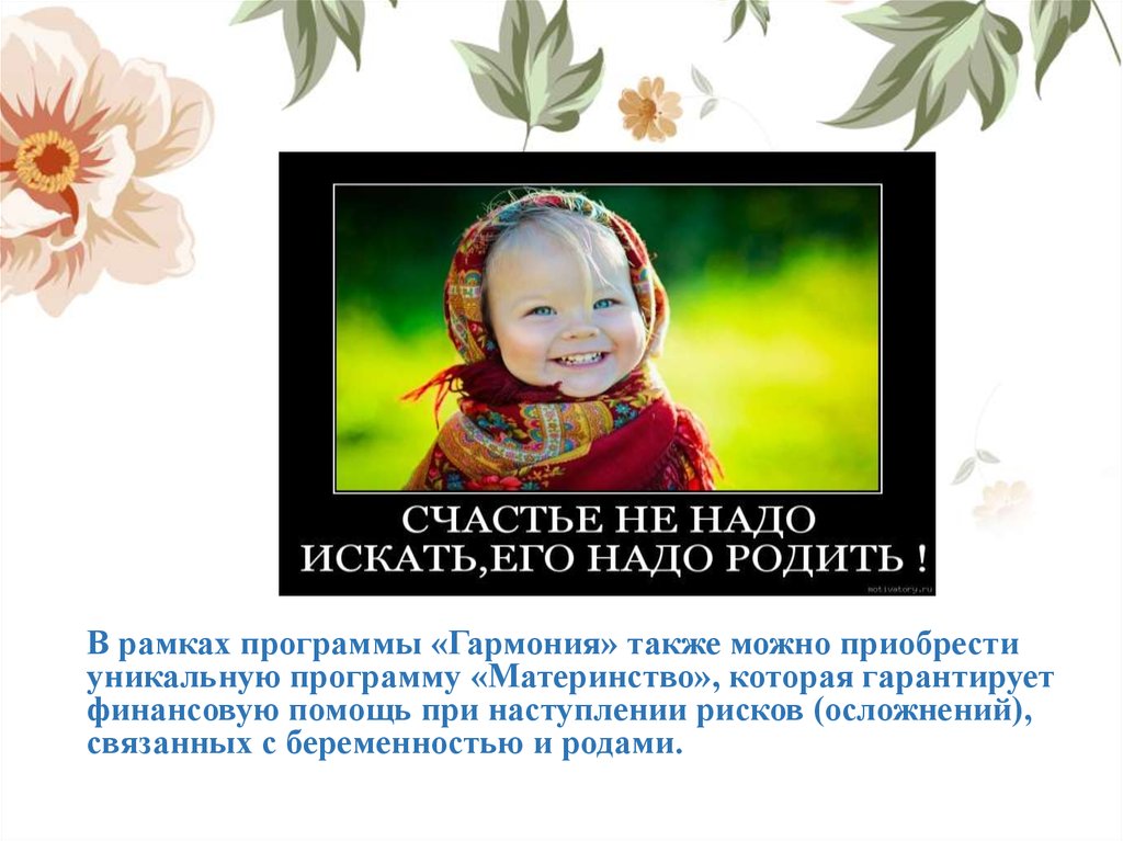 В рамках программы «Гармония» также можно приобрестиуникальную программу «Материнство», которая гарантирует