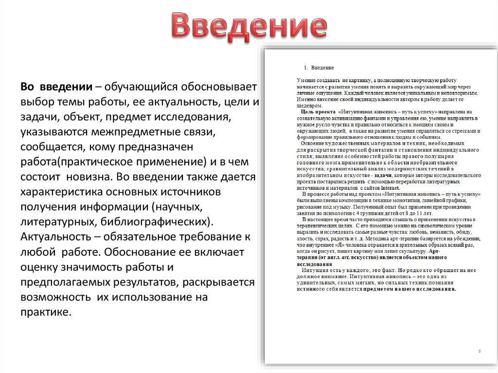 Во введении – обучающийся обосновываетвыбор темы работы, ее актуальность, цели и