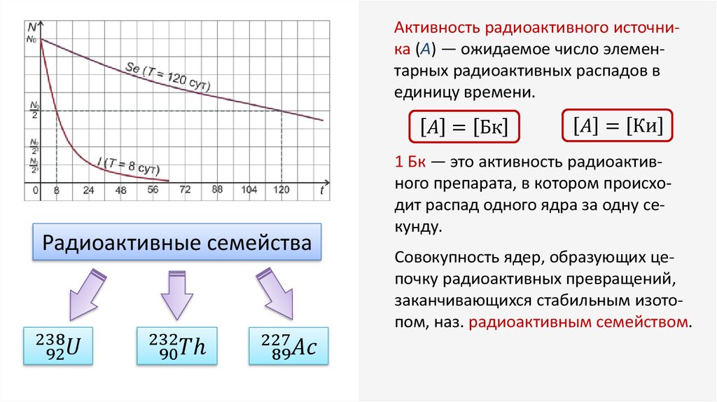 Радиоактивность — это явление самопроизвольного превращения неустойчивого изотопа одного химического элемента в изотоп другого элемента, сопровождающееся испусканием частиц, обладающих большойпроникающей способностью.