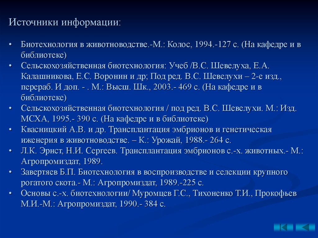 Источники информации:• Биотехнология в животноводстве.-М.: Колос, 1994.-127 с. (На кафедре и в