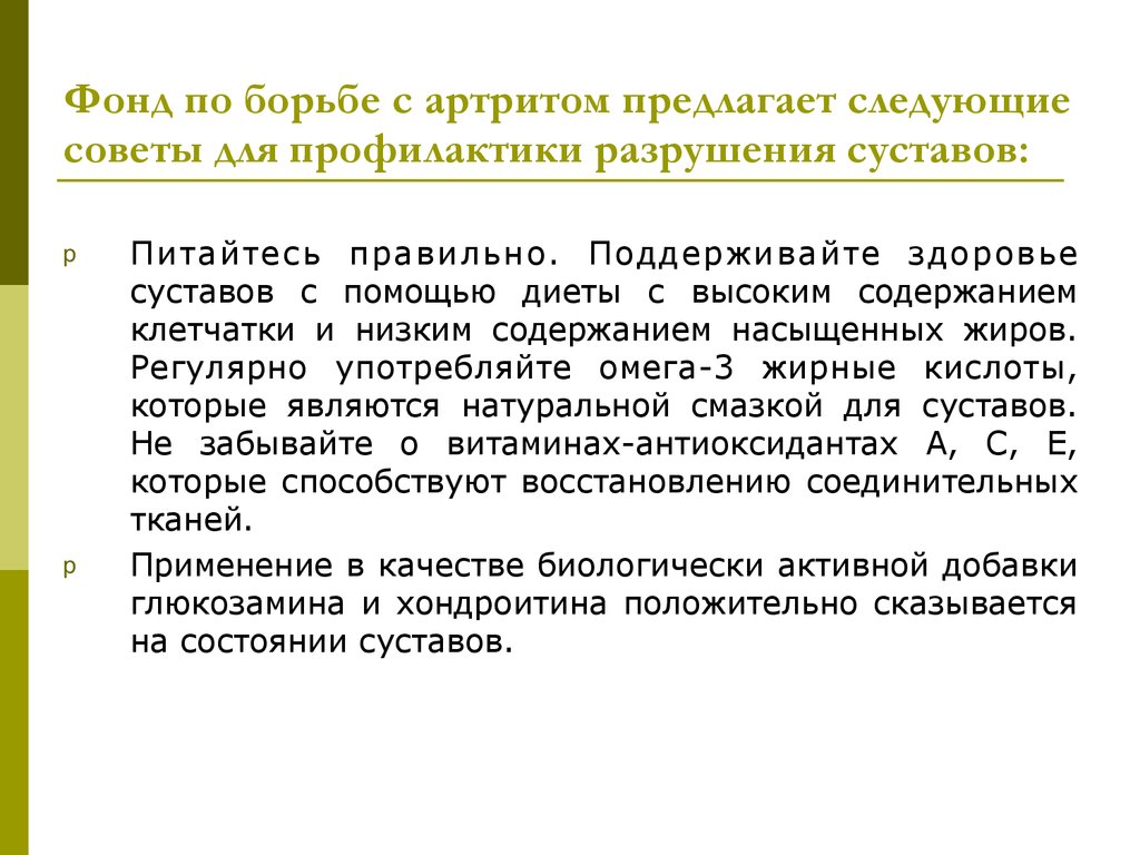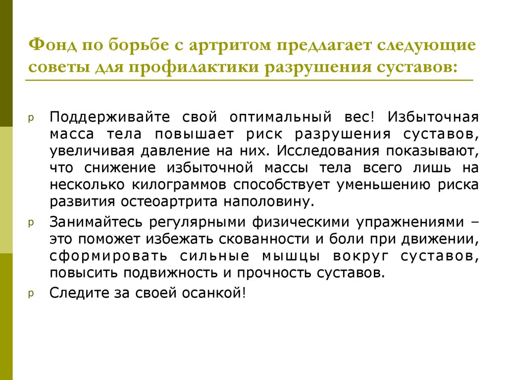 Фонд по борьбе с артритом предлагает следующиесоветы для профилактики разрушения суставов: